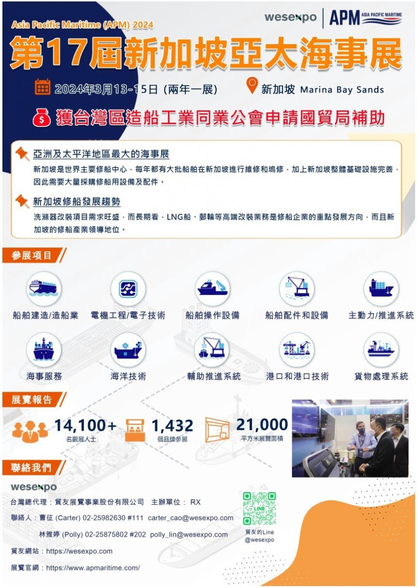 【展會】2024/03/13 ~ 15「2024 第17屆新加坡亞太海事展」歡迎本會會員企業報名參加。