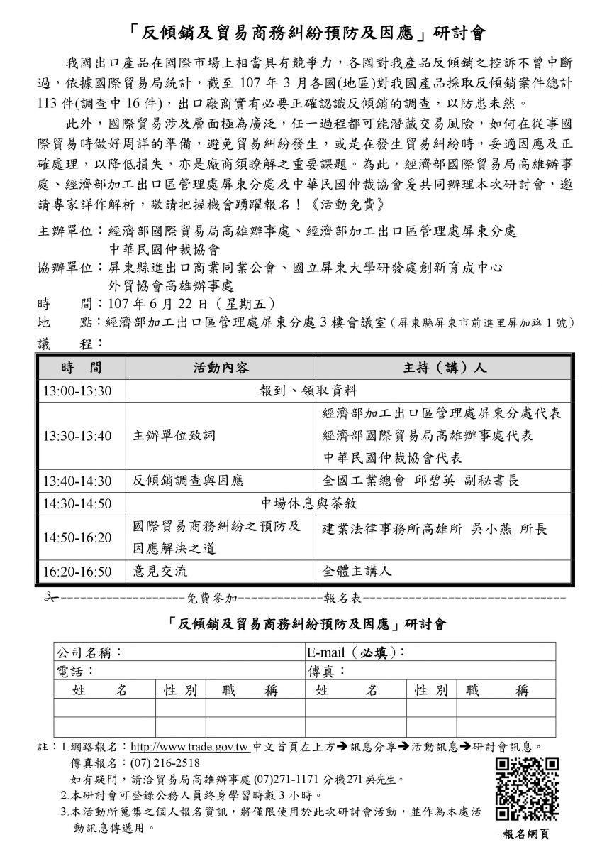 【活動】2018/06/22「反傾銷及貿易商務糾紛預防及因應」研討會