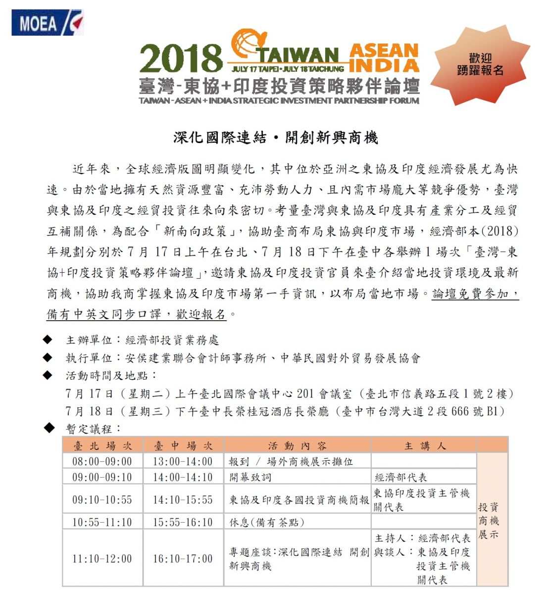 【活動訊息】經濟部「2018臺灣-東協印度投資策略夥伴論壇」於7月17及18日登場,歡迎會員廠商踴躍報名。