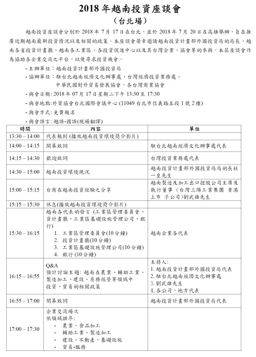 【活動】2018「越南投資座談會」台北場於7月17日舉行,歡迎會員廠商踴躍報名。