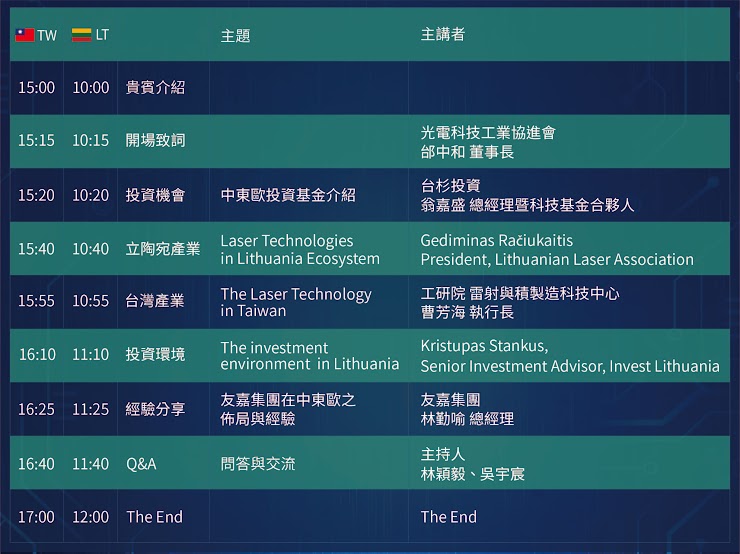 立陶宛與台灣在相同的價值與理念下,在雷射科技與光學產業方面有很卓越的發展基礎及產業聚落,期盼與臺灣在該領域進一步合作與交流,因此光電協進會為促進雙方在光學雷射領域之合作,特別辦理「台灣-立陶宛 高科技產業合作商機說明會」,邀請雙方產業代表、學者專家共同與會,歡迎各位廠商會員與企業先進踴躍報名參加,報名連結:https://reurl.cc/yr4o0M